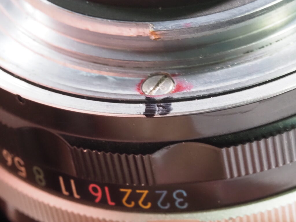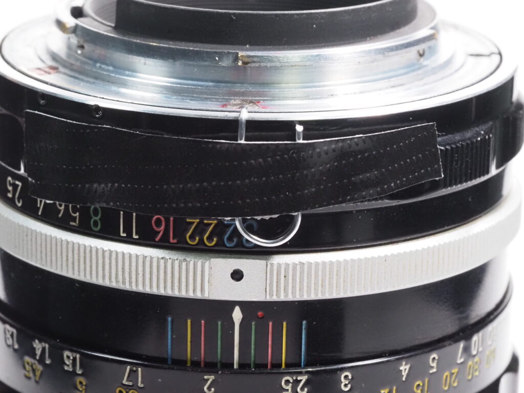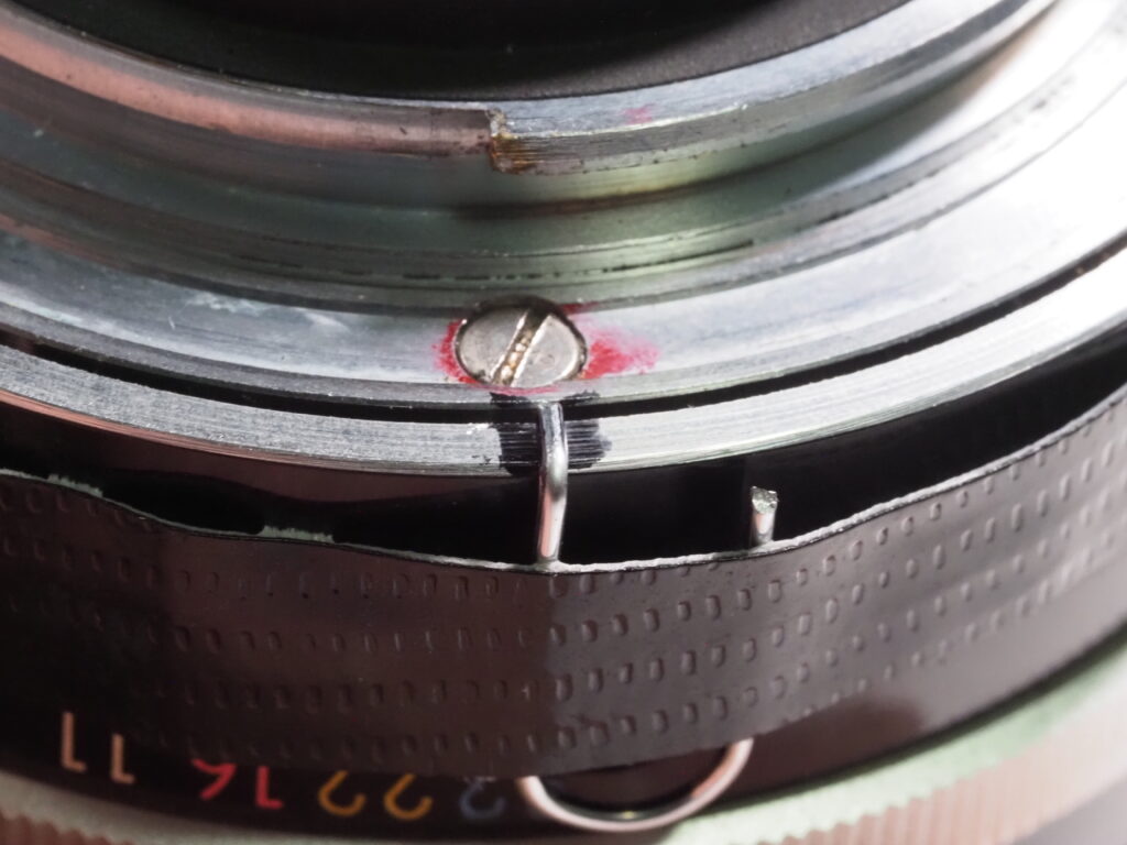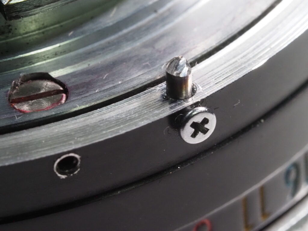Next, using the same drill bit that was used to drill the hole, small piece is cut off with an abrasive cut off wheel on a Dremel tool and inserted into the hole with a very tiny bit of superglue. (Be very careful here, too much and you won’t be able to turn the aperture ring. No, I did not have to learn this the hard way!)