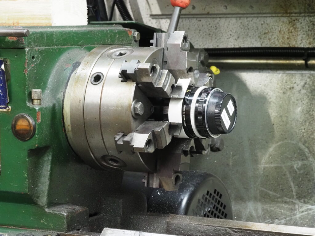 So, first course of business. Using my metal lathe I remove the entire rim from the lens. (YIKES!, is he really doing this!) These lenses are VERY inexpensive. Some of the Non-Ai lenses I have I got for free on an old camera that I sold for what I paid and sometimes more. They have no real collector value. So, what the heck!
