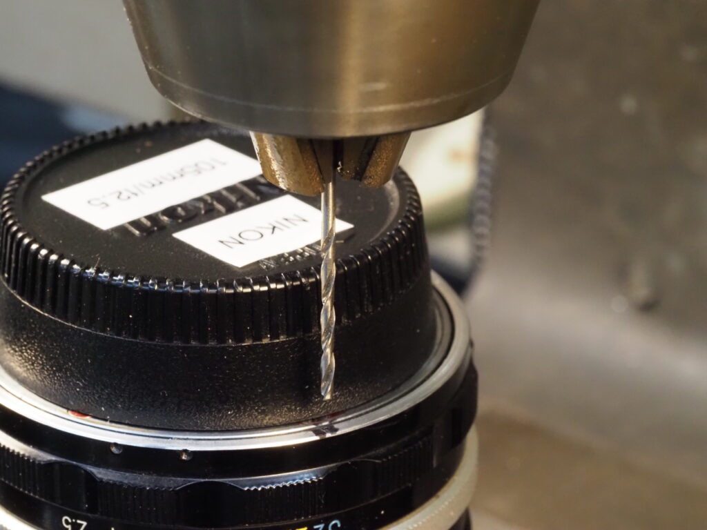 A 1/16″ drill bit is installed, and very, very carefully a hole is drilled into the rim of the lense.
